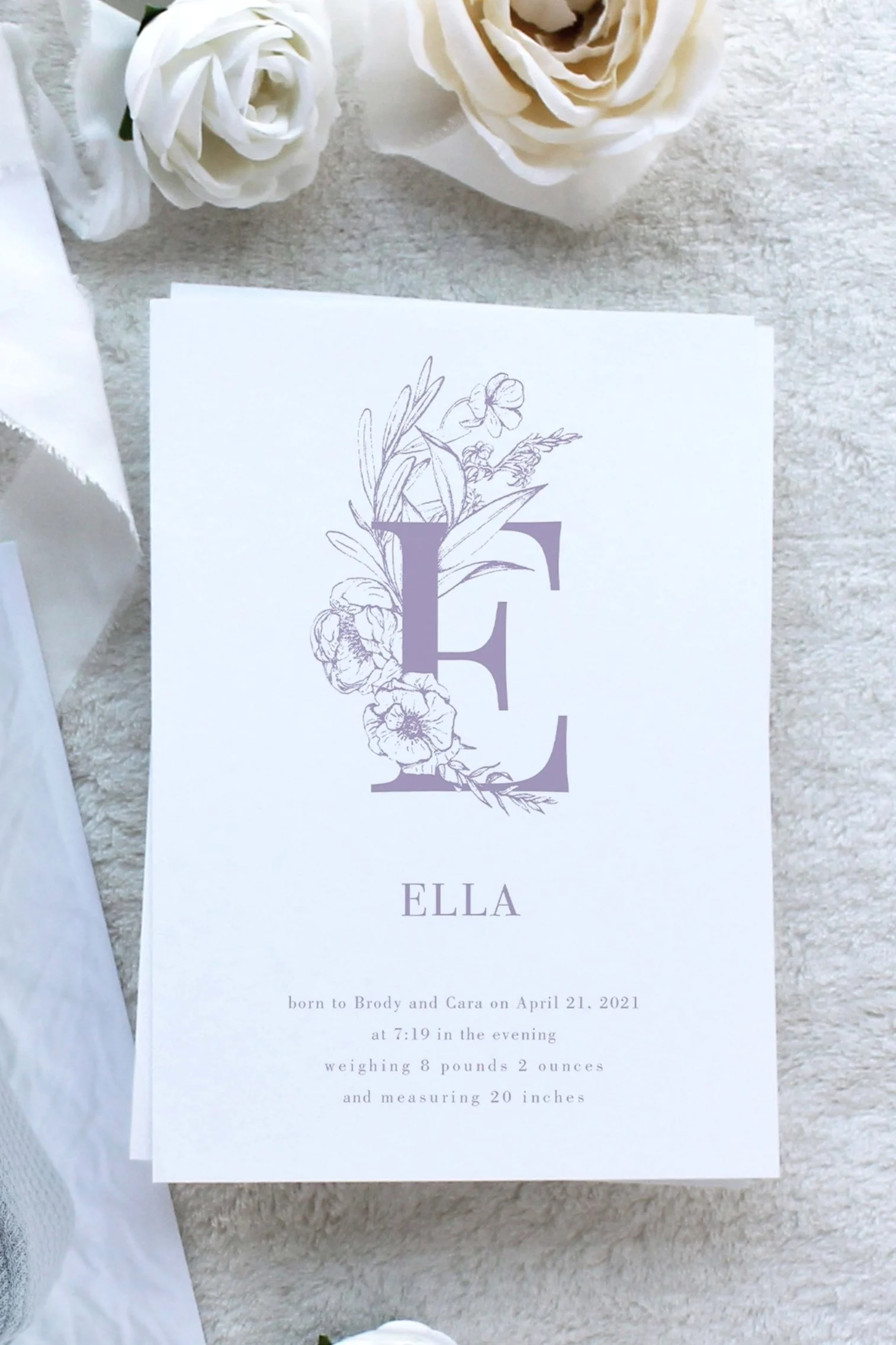 Our Ella birth announcement features a floral monogram design to highlight the first letter of your baby’s name. The Ella birth announcement can be customized with one, or several, of your favorite photos, and your choice of embellishments to make it as unique and special as your precious little one.