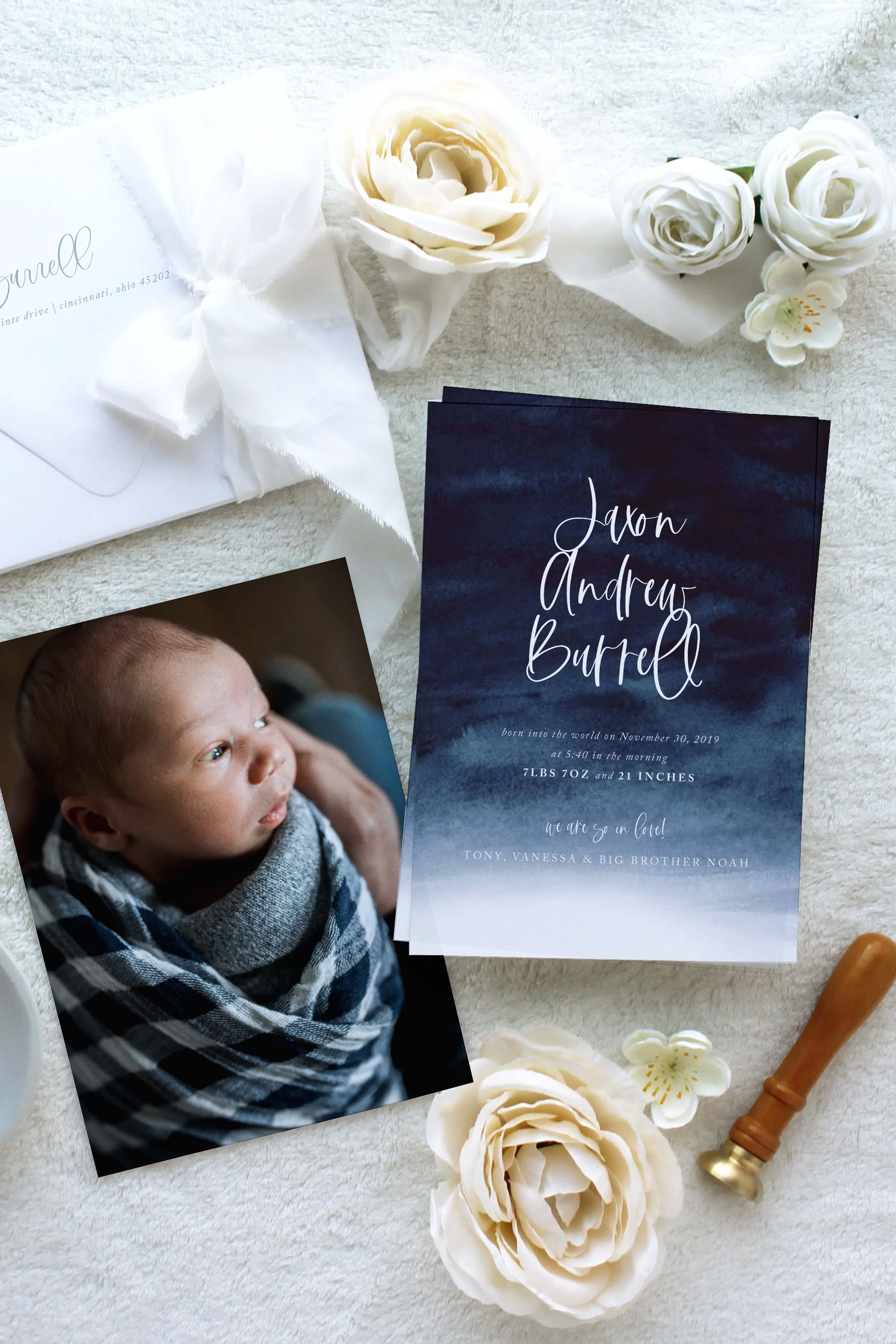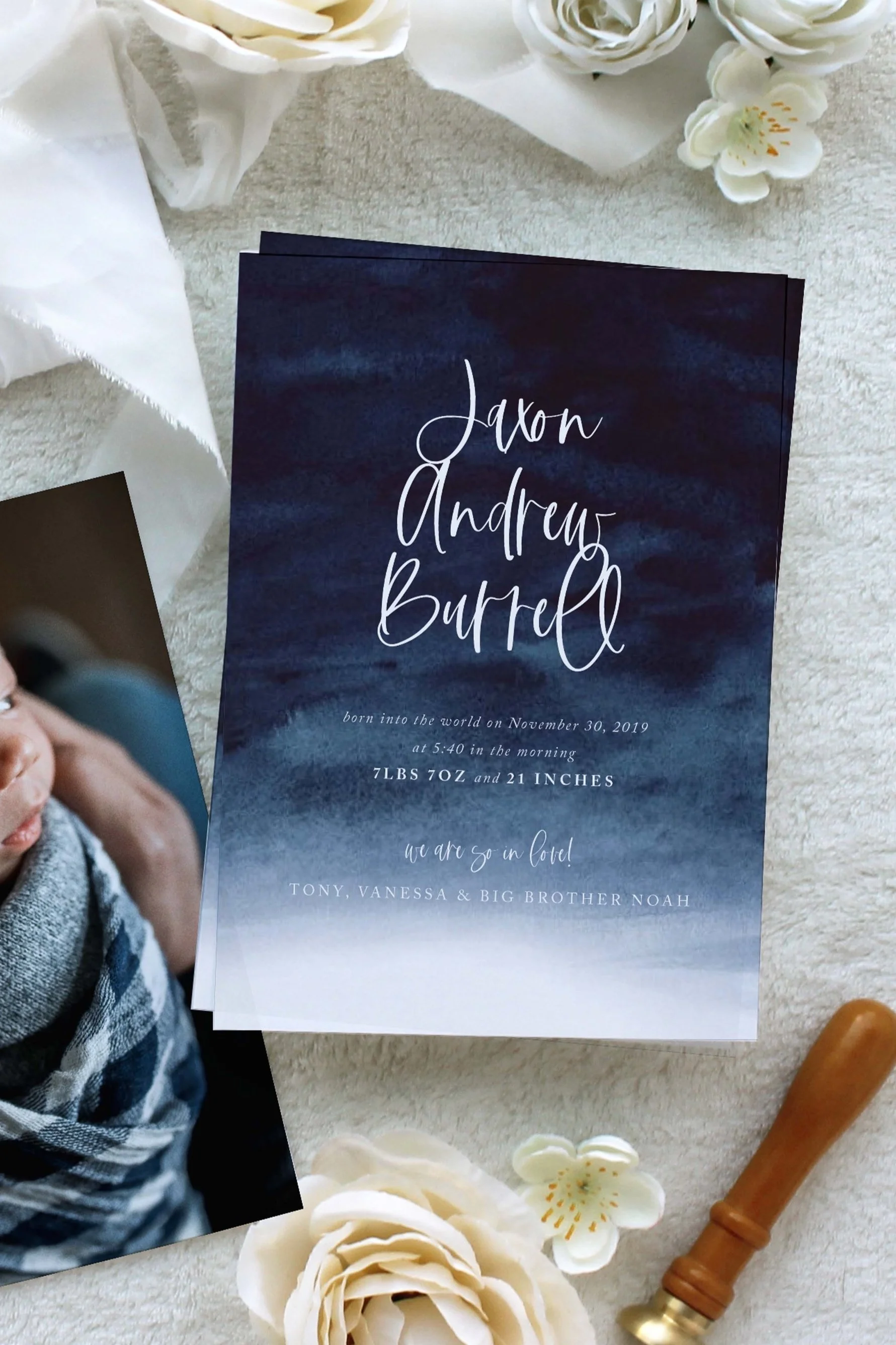 Our Jaxon birth announcement features a beautiful ombre watercolor design. The Jaxon birth announcement can be customized with one, or several, of your favorite photos, and your choice of embellishments to make it as unique and special as your precious little one.