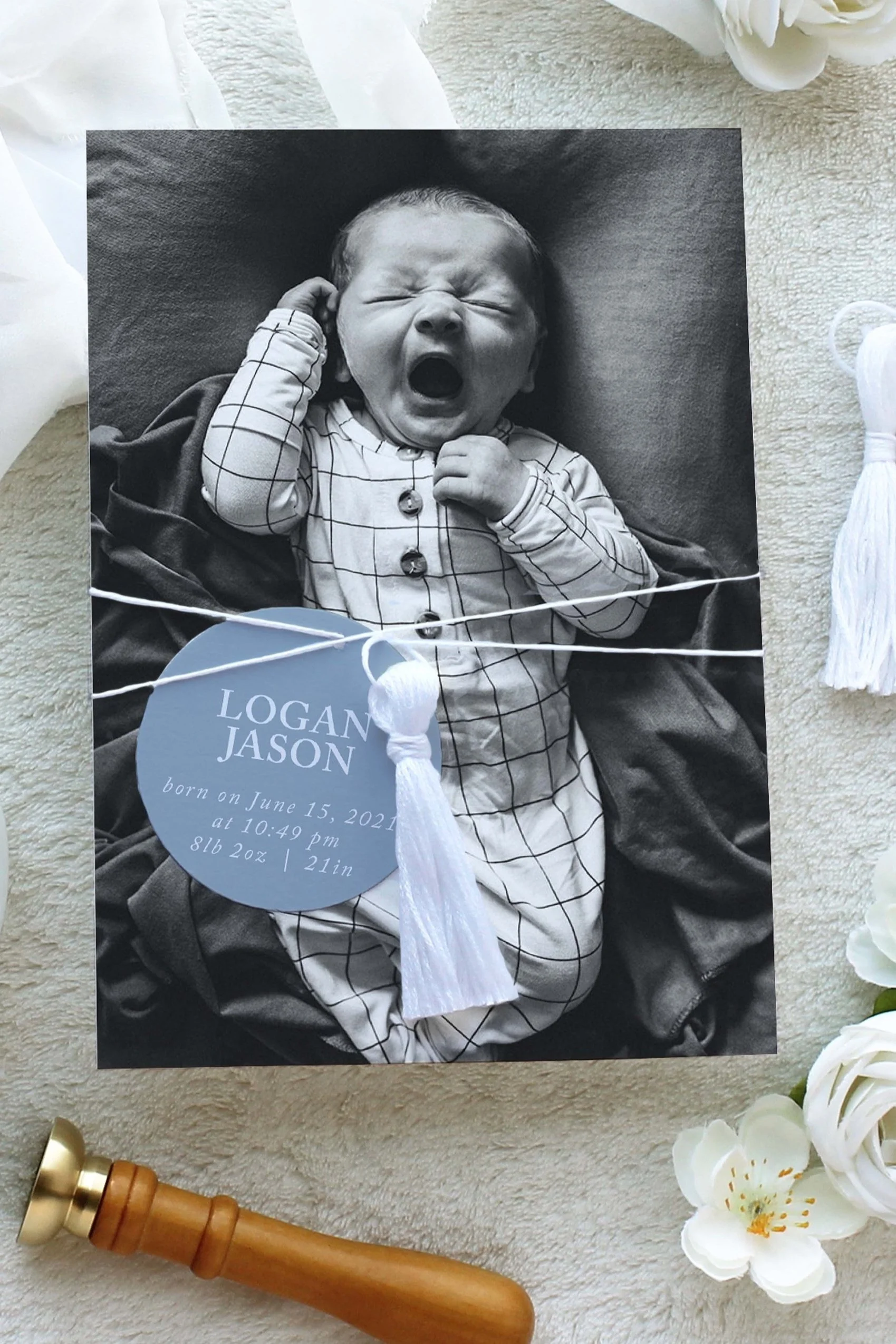 Our Logan birth announcement features a full photo card with a hanging tag with your baby’s name and important birth details. The Logan birth announcement can be customized with one, or several, of your favorite photos, and your choice of embellishments to make it as unique and special as your precious little one.